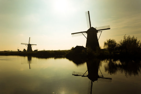 Traditional dutch windmills in countryside at Kinderdijk, Rotter