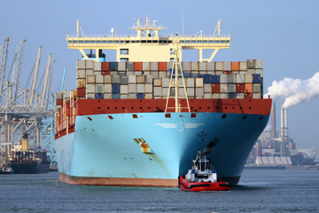 riesen Containerschiff von vorne in Rotterdamm Hafen