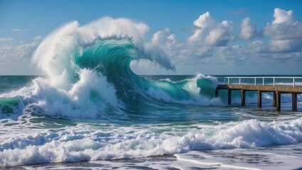 Vigorous sea wave hitting the shoreline under a sunny sky with gusty winds