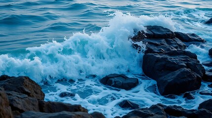 Crashing ocean waves on rocky shoreline capturing natural beauty