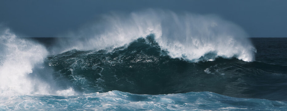 Dramatic ocean wave crashing on rocky shore at stormy coastline