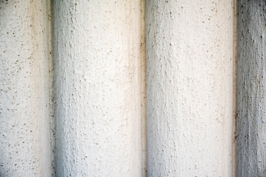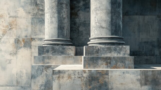 Weathered stone bases of several large columns. Sunlight creates shadows and rough texture and classical architecture. Enduring strength of stone is evident in detailed base of classical column