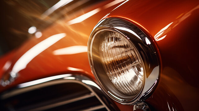 Close-up of vintage orange car's headlight and grille at outdoor auto show