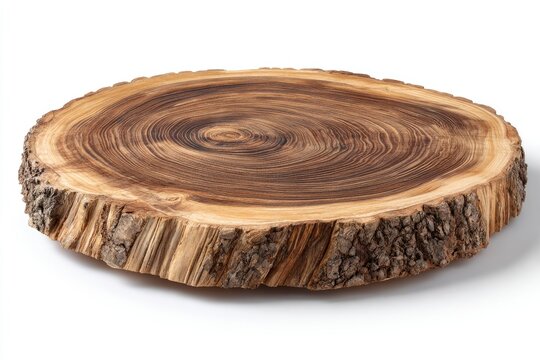 A rustic, round wood slice with bark edge, showing concentric growth rings; polished, smooth top surface