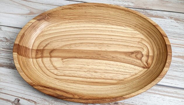 Empty round wooden plate with white tablecloth on white wooden table. Top view image.