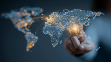 Business strategist analyzing global trade routes with holographic map
