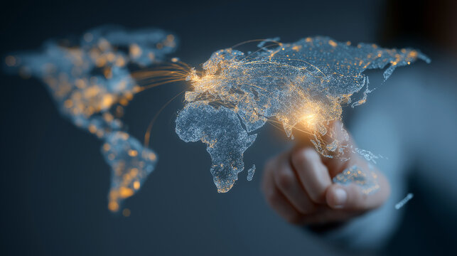 Digital world map with data routes and grid overlay