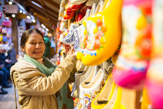 Koog aan de Zaan, Netherlands. July 2022.Traditional yellow wooden shoes or clogs in farmhouse, Old pair of vintage wooden shoes, Typical rural countryside in Netherlands.