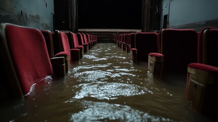 Rows of red seats in a flooded theater create a haunting, yet beautiful, scene.