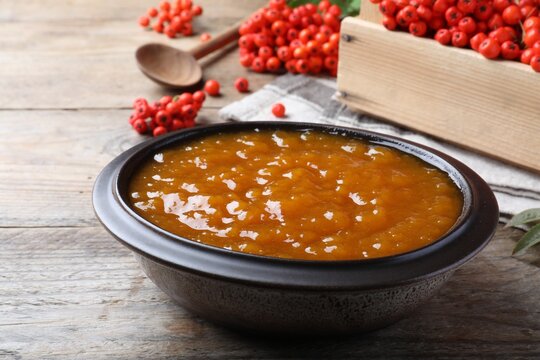 Delicious rowan jam in bowl on wooden table