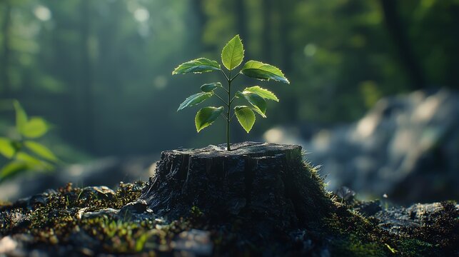 Young rowan tree seedling grow from old stump in poland forest.