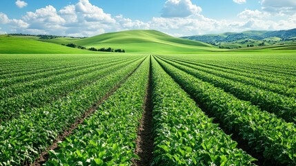 Lush green rows of crops stretch across a vast, rolling landscape under a bright sky