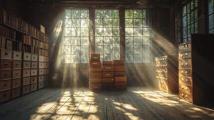 A dusty archive with rows of old boxes and filing cabinets, sunlight streaming through cracked windows, creating beams of light on the wooden floor, vintage and nostalgic atmosphere, studious mood