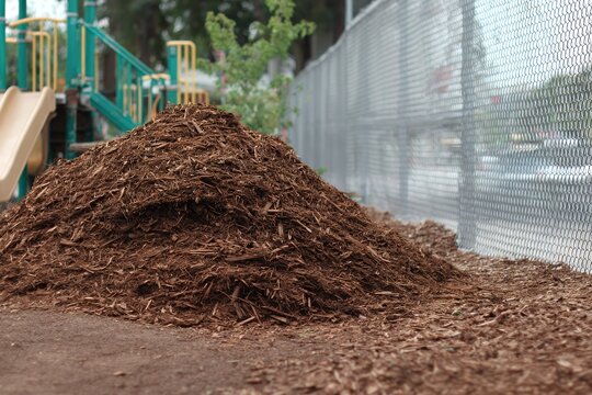 The boundary between the mulch rubber playground and the sidewalk tiles.
