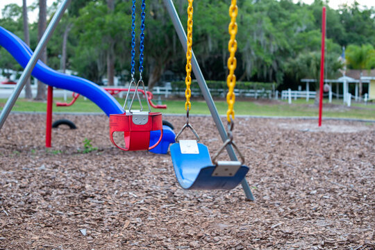 Multiple plastic and rubber swings hanging from chains in a children's park. There's a blue plastic slide in the background with large lush trees and benches. The ground is covered in tree mulch.