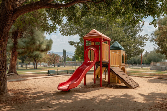 A sunlit playground set with slides and climbing stairs sits in a residential park, surrounded by trees and homes, symbolizing childhood, community, and outdoor fun.