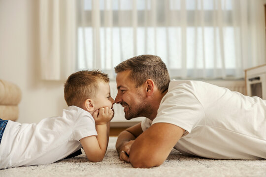 A father and son rubbing their noses and bonding at home.