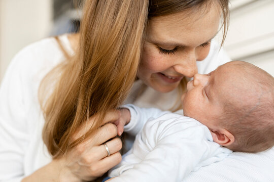 Close-up of smiling mother rubbing nose with sleeping baby boy at home