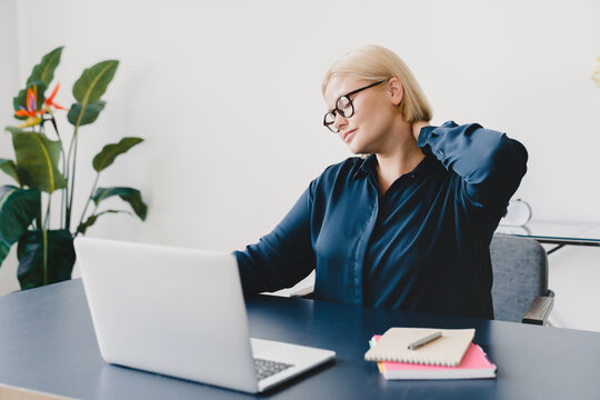Young caucasian tired sad businesswoman suffering from neck pain, stretching rubbing her neck nerve spasm at workplace at office desk after sedentary occupation. Health problems