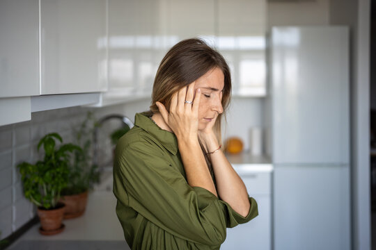 Tired woman feeling headache rubbing temples standing on kitchen with closed eyes at home. Blonde female suffering from migraine head pain. Having headache cephalalgia premenstrual syndrome feel bad.