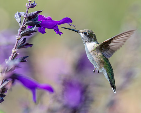 Female Ruby Throated Hummingbird (Archilochus colubris) hovering.