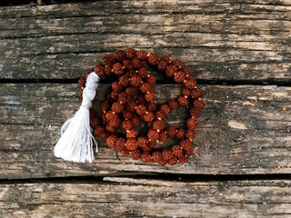 Rosary beads on the wooden background. Rudraksha Mala for Mantras. 108 beads.