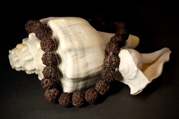 conch shells with rudraksh beads necklace on it represents hinduism culture