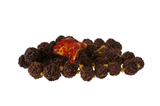 Buddhist or Hinduist Japa mala (prayer beads) made of rudraksha isolated