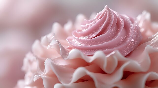 Delicate pink buttercream swirls with ruffled edges and soft sugar sparkles create an elegant pastel dessert background for wedding and celebration designs.