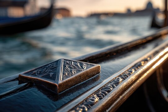 Detailed shot Venice gondolas ornate trim featuring a metal cap with floral details and a blurred water backdrop
