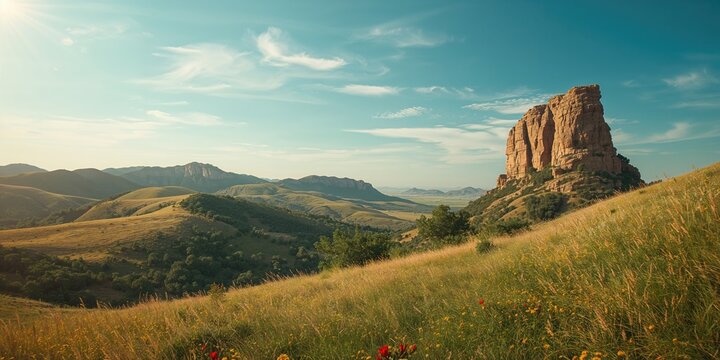 Golden sunrise over serene rolling hills