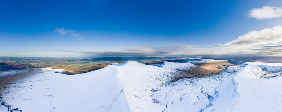 Aerial view of beautiful snow covered mountain peaks rising above a deep valley