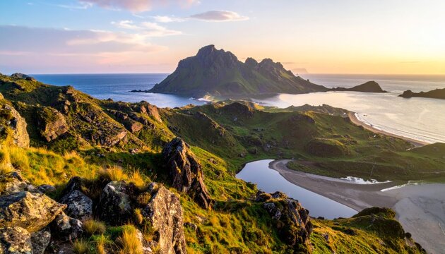 Sunset over rolling hills and coastline