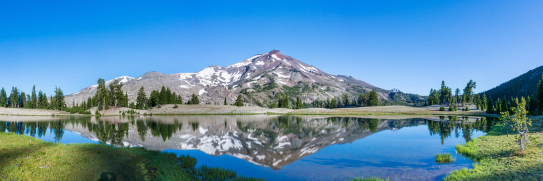 Mountain landscape with clear blue sky, morning light, reflective water, and a wide panoramic view.