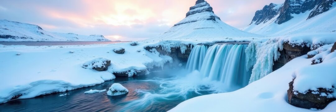 Majestic snow-capped peak at dawn with pink-orange glow