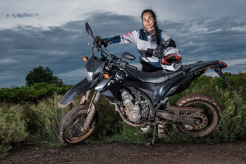 Woman posing behind her super moto style motorcycle on dirt road