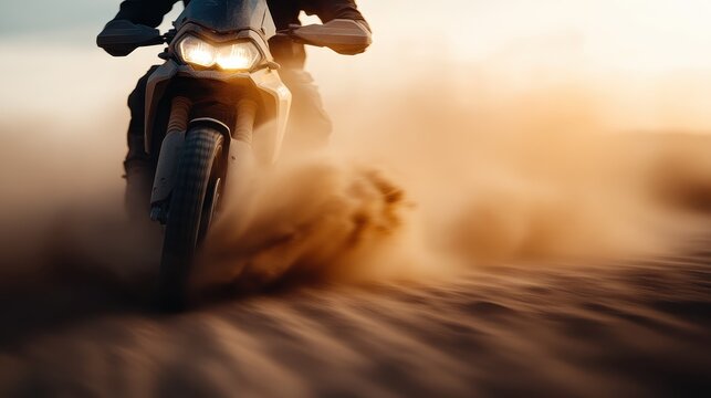 A powerful motorcycle kicks up dust on a rugged trail during sunset, embodying the thrill of adventure and freedom that comes from exploring the great outdoors.