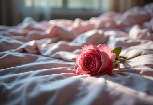 A single pink rose rests on a rumpled bed bathed in soft morning light evoking romance and gentle awakening