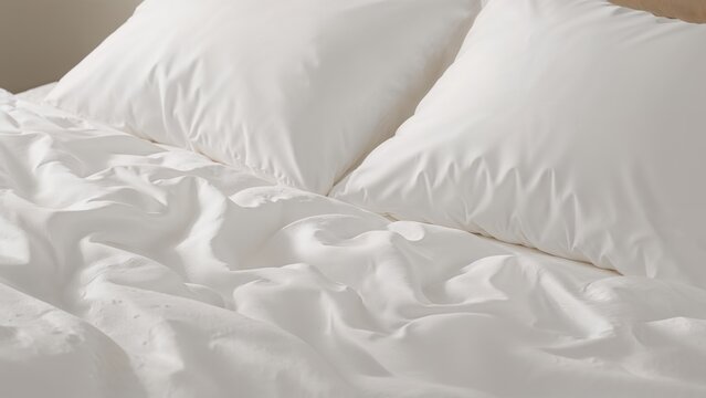 A soft, clean, and smooth white bed with pillows and rumpled sheets.