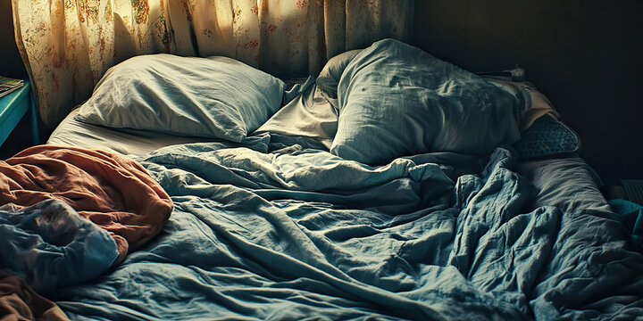 A disheveled bed, covered in rumpled sheets and hiding untold secrets.