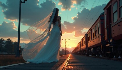 Runaway bride at sunset: woman in white wedding dress and veil standing on train platform with trains