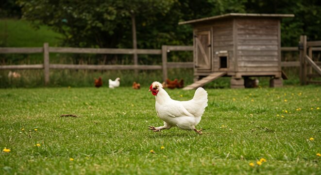 'free running chicken hen range meadow natural bird agriculture green white farmland red field feather grass summer outside farm poultry female farming animal run rural outdoors yard domestic nature'