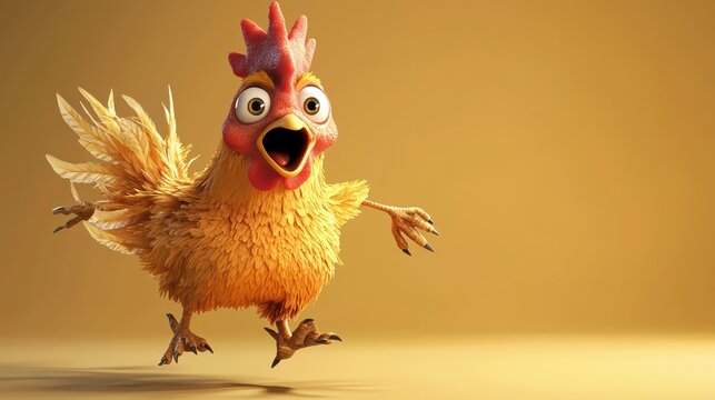 A cheerful animated chicken with bright colors and an expressive face, energetically running against a warm, neutral background.