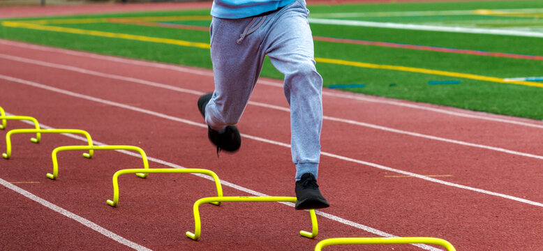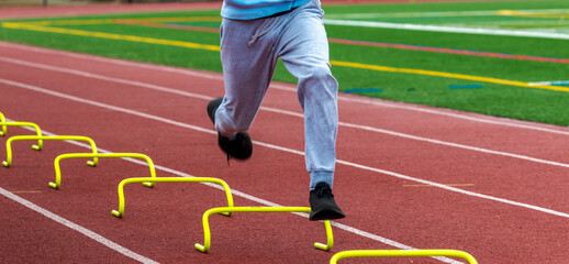 Legs of runner running over yellow mini hurdles on a track close up