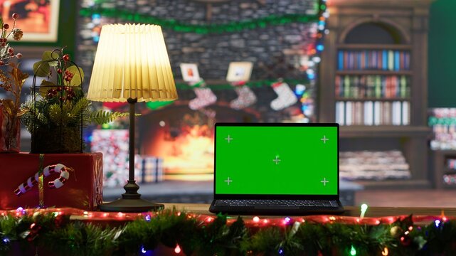 Warm festive empty log cabin with a green screen running on laptop, colorful decorations and garlands creating a magical vibe for the Christmas holiday season. Traditional festivity.
