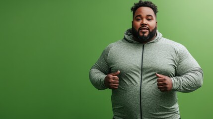 A plus-size man jogging in place, dressed in athletic wear, with a determined look, isolated against a green background, showcasing his active lifestyle and fitness journey.