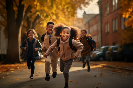 group of happy elementary school students running