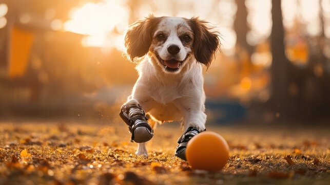 Happy Dog with a Prosthetic Leg Running After a Ball