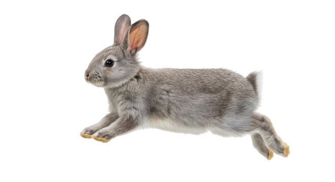 Studio portrait of cute rabbit isolated on transparent png background, happy bunny running on floor, adorable fluffy rabbit that sniffing.