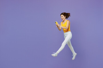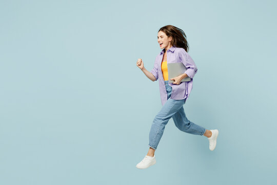 Full body side view young smiling excited caucasian fun woman wear blue shirt beige t-shirt jump high run fast hurry up isolated on plain yellow background studio portrait. People lifestyle concept.